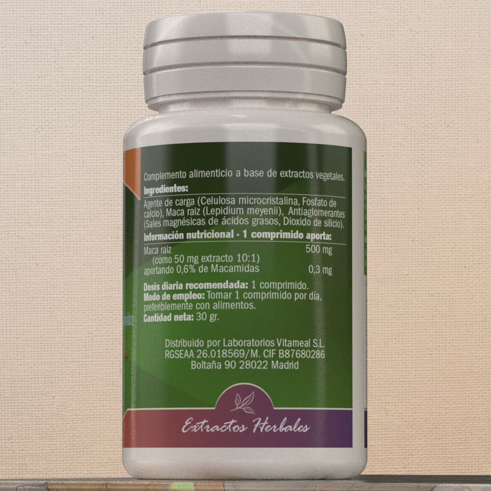 Agente de carga (Celulosa microcristalina, Fosfato de Calcio), Maca raíz (Lepidium meyenil), Antiaglomerantes (Estereato magnesio, Dióxido de silicio).